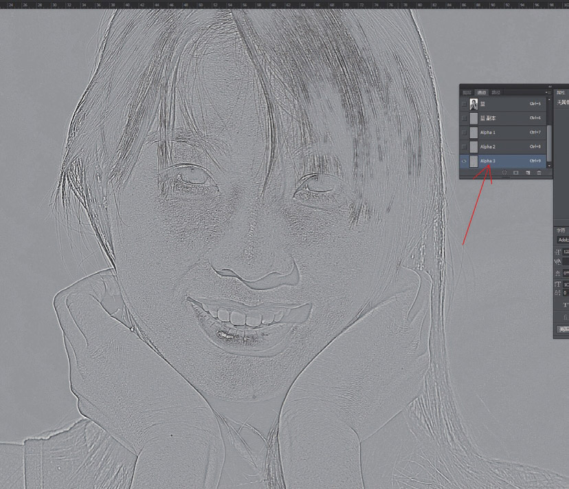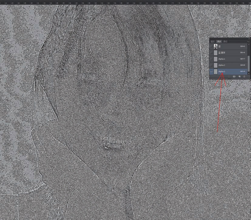 18. 把步骤16、步骤17再操作两次,得到最强烈的高反差质感的“Alpha3”通道。