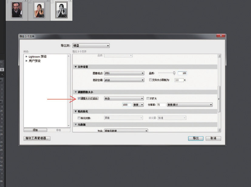 2. 从Lightroom里导出图片时,不要勾选“调整大小以适合”复选框,因为还要在Photoshop里进行处理,所以保留原图大小导出。