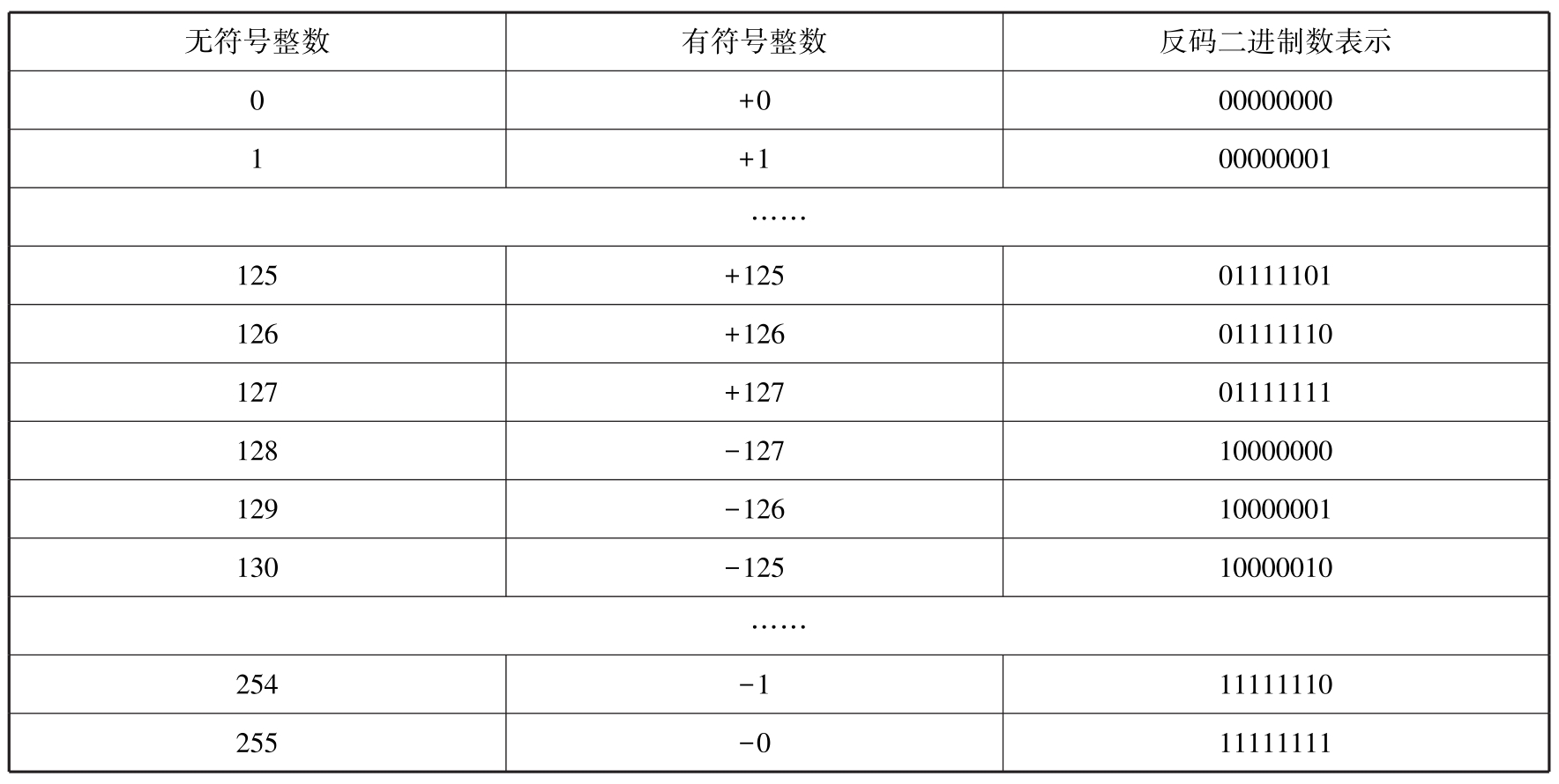 例如,原码10101011(-43 10 )的反码形式为11010100(-43 10 )。有符号数用反码表示的范围为-(2 N-1 -1)~(2 N-1 -1),以及+0和-0。对于8位二进制数而言,用反码表示时,其表示数的范围为(-127) 10 ~(+127) 10 ,以及00000000(+0)或者11111111(-0),如表3.2所示。