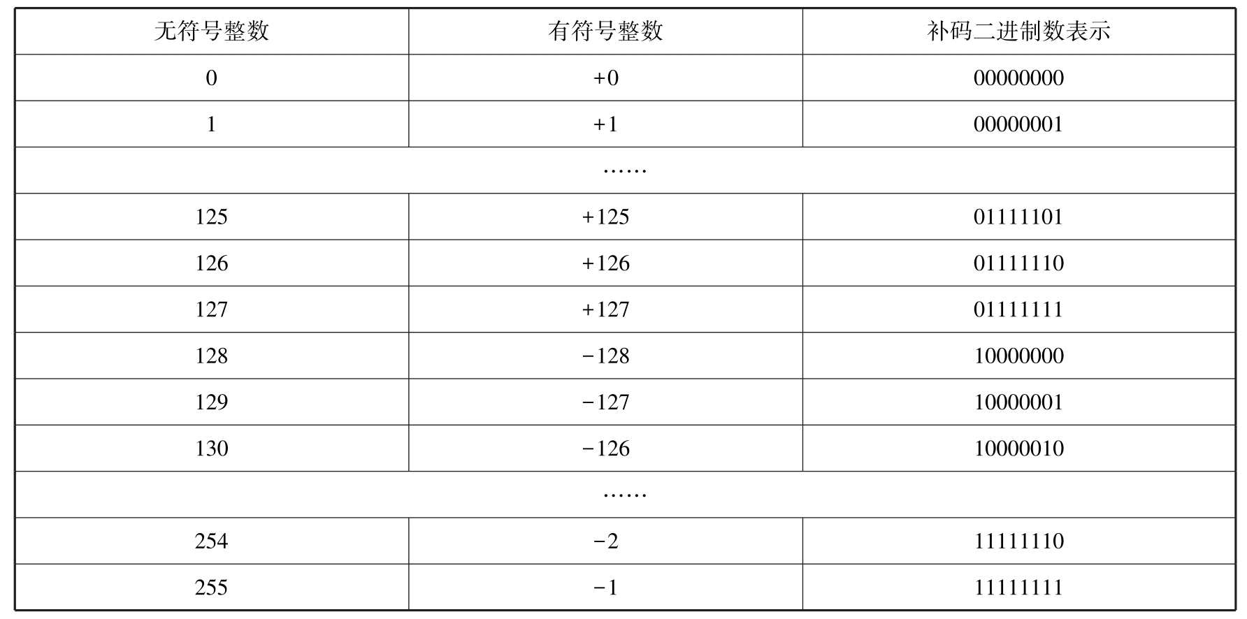 这样,当增加一个符号位(第8位)后,可以表示(-127) 10 ~(+127) 10 的数值。这种表示数值的方法所导致的结果就是有两种方式用于表示数值0,即00000000,表示+0;10000000,表示-0。十进制数(-43) 10 用8位二进制原码可以表示为10101011。有符号整数和无符号整数的二进制原码表示如表3.1所示。