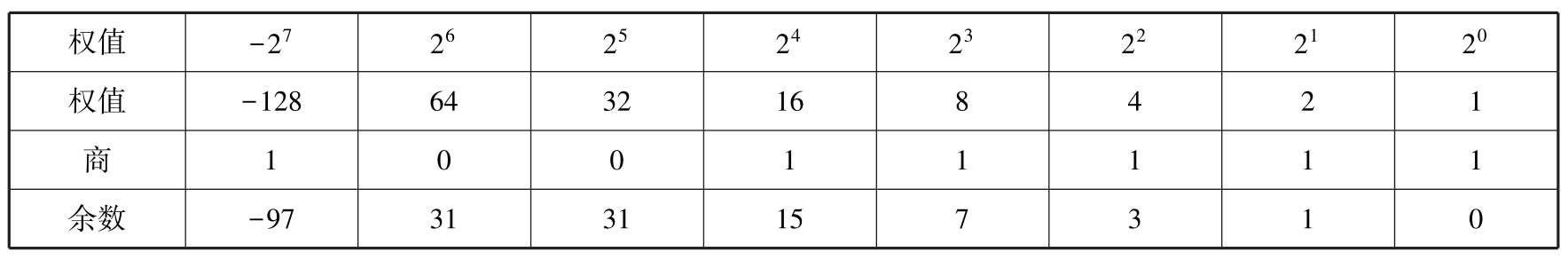 例如,对于(-97) 10 而言,假设字长为8位,其所对应的二进制补码为(10011111) 2 ,如表3.4所示。