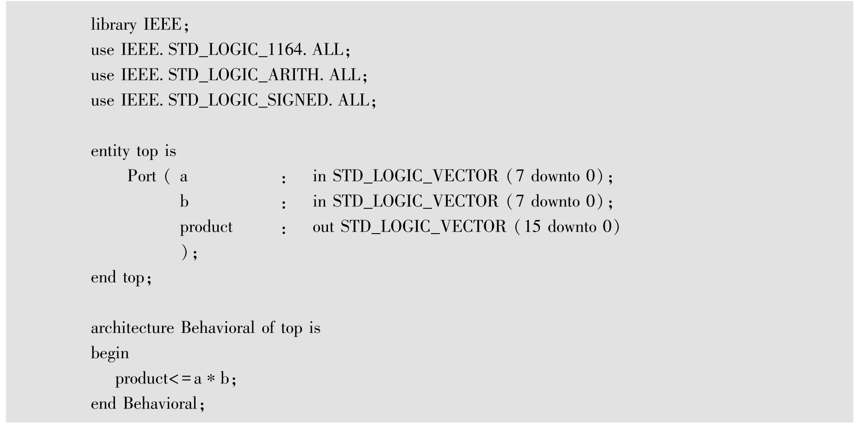 代码清单3-11 有符号整数乘法运算的VHDL描述