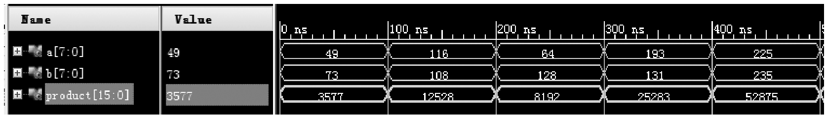 无符号整数乘法运算的仿真结果如图3.9所示。