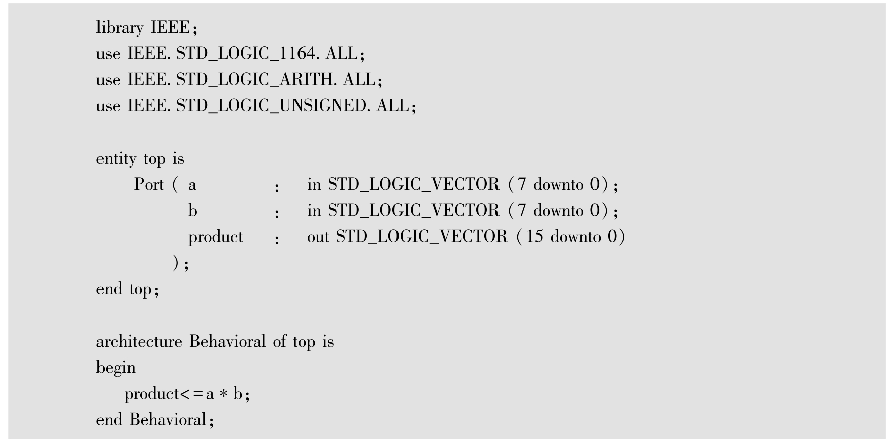 无符号整数乘法运算的VHDL描述如代码清单3-9所示。