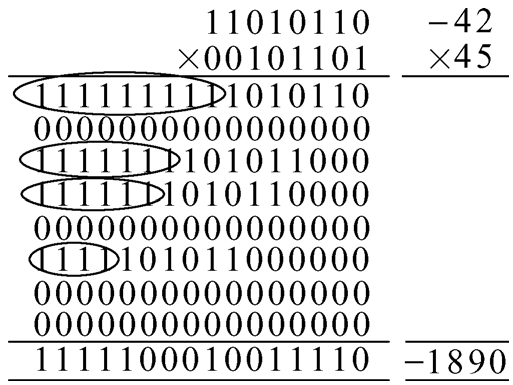 操作数为一个正数和一个负数的乘法运算如图3.10所示,只需要进行符号扩展。