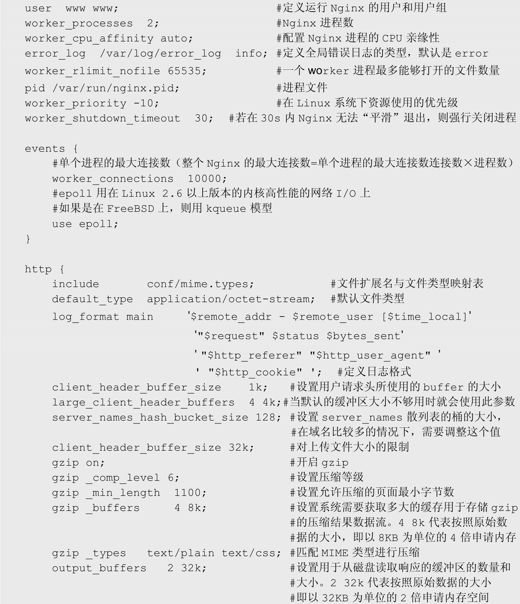 关于日志记录的配置。如果将error_log配置为error级别,可以减少不必要的日志记录;如果是测试环境可以设置为info级别。配置日志记录需要考虑硬盘的独立性,不要使用Linux的根分区,以避免出现大量的I/O影响Linux服务器的吞吐能力;要单独挂载到一个磁盘上,使用独立的I/O。