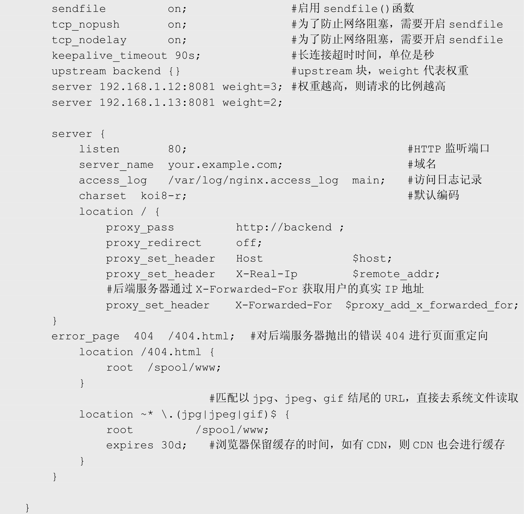 配置后端服务器,可以结合 proxy_next_upstream等指令进行大量的优化。具体内容将会在以后的章节中进一步讲解。