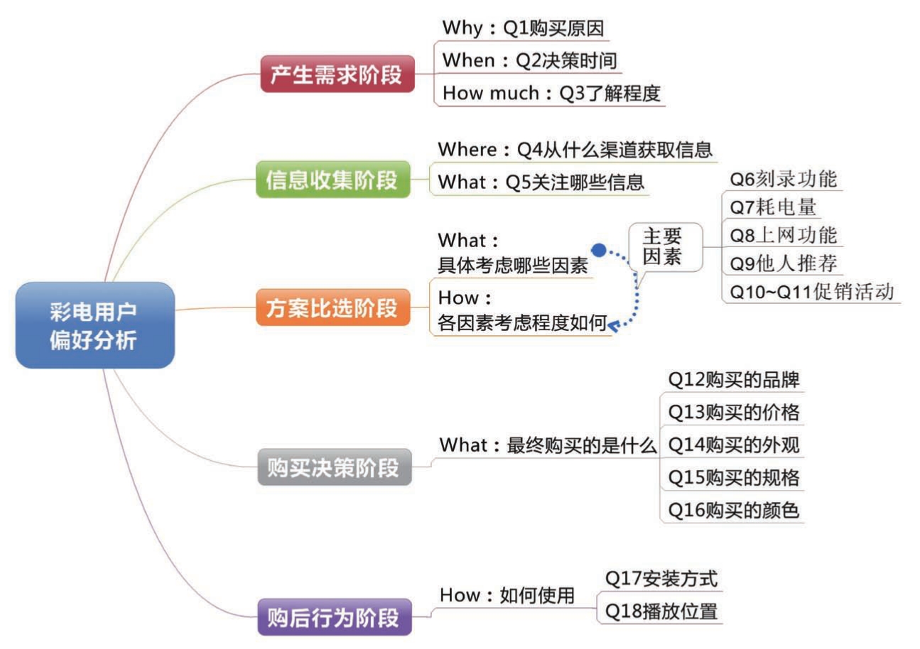 于是,从时间和结构两条线索出发,应用用户行为五阶段理论和5W2H分析法,并结合彩电行业的特点,本案例的调研内容如图2-11所示,形成了彩电用户偏好分析体系。