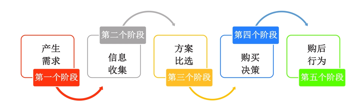 所以在时间线索上,用户行为包括产生需求、信息收集、方案比选、购买决策和购后行为5个阶段(见图2-7)。