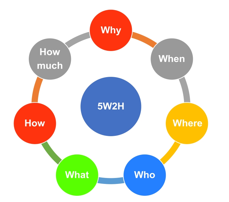时间、地点、人物、事件、原因、方式方法、程度七要素,它们对应的英文分别为When、Where、Who、What、Why、How和How much,一共是5个W和2个H,简称5W2H分析法(见图2-9)。