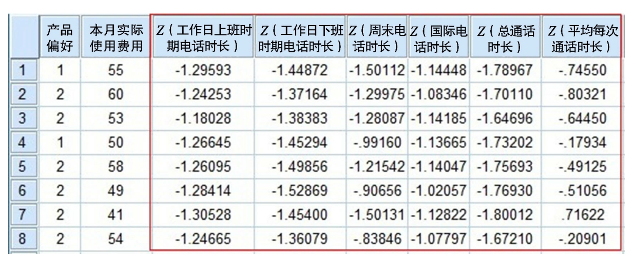 本例6个变量的标准化结果为如图3-7所示的红框数据。