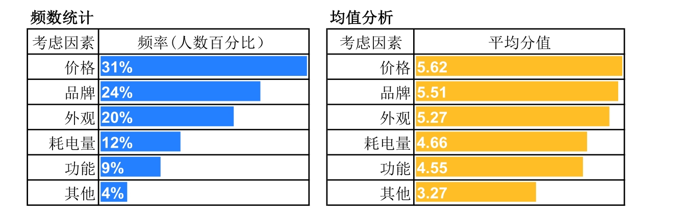 分类型数据,运用频数统计(统计各因素被选的人数占比)进行对比;而数值型数据,运用均值分析(统计各因素的平均分值)进行对比(见图3-5)。