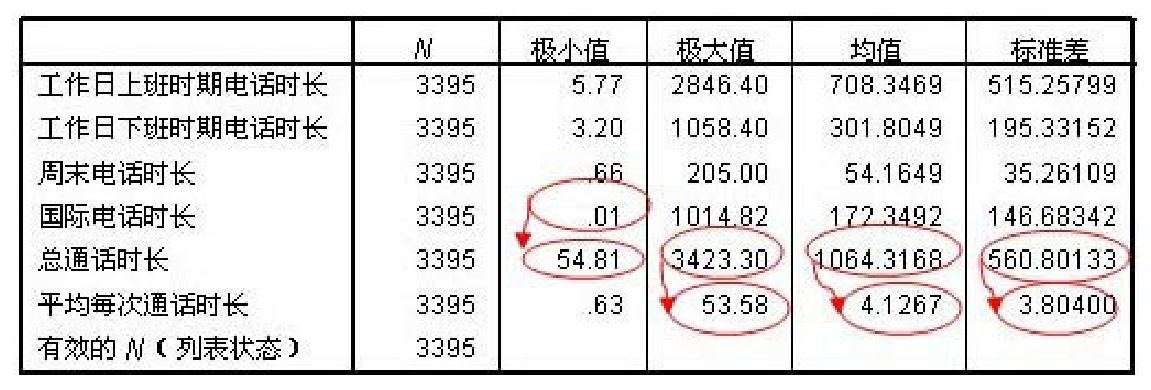 某运营商想对手机用户进行分类,为此其调查了3395个手机用户在各种场景中的通话时长:工作日上班时期电话时长、工作日下班时期电话时长、周末电话时长、国际电话时长、总通话时长和平均每次通话时长。通过描述统计,得到它们的数据特征(见图3-6)。请问能否直接以这6个变量为维度,对手机用户进行分类?