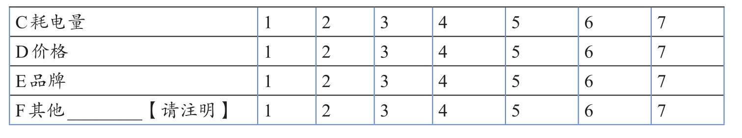 A外观 B功能 C耗电量 D价格 E品牌 F其他__________【请注明】