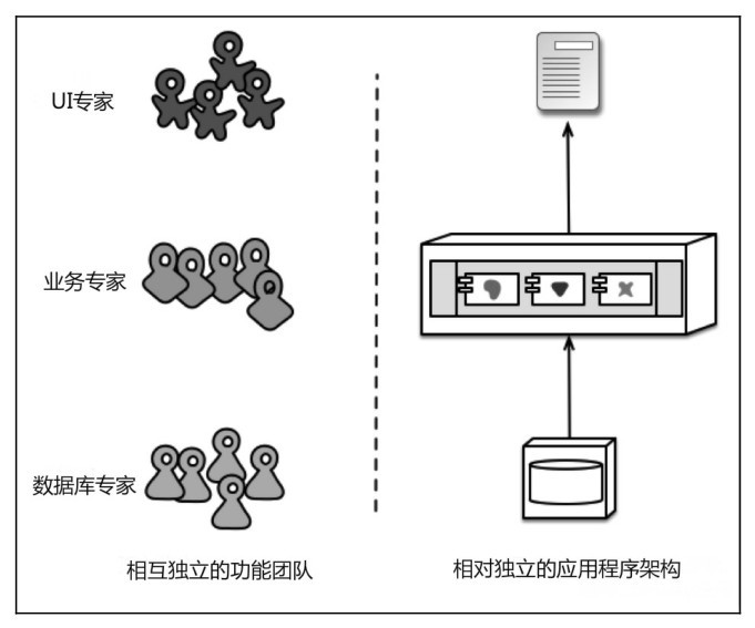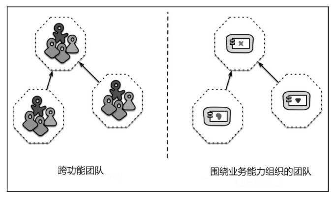 微服务架构风格则采用围绕业务线进行划分的方式,以保证一个团队中能拥有UI工程师、开发工程师、DBA和项目经理。实施微服务后的组织结构如图1-7所示。