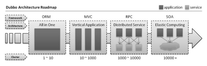2011年前后,阿里巴巴开源的 Dubbo 框架成为对后世影响深远的一款分布式服务框架。Dubbo 官方文档公布了一张有关 SOA 系统演化过程的图片(见图1-3),彻底奏响了分布式和SOA时代的最强音。服务发现、负载均衡、失效转移、动态扩容、数据分片、调用链路监控等分布式系统的核心功能也一个个趋于成熟。