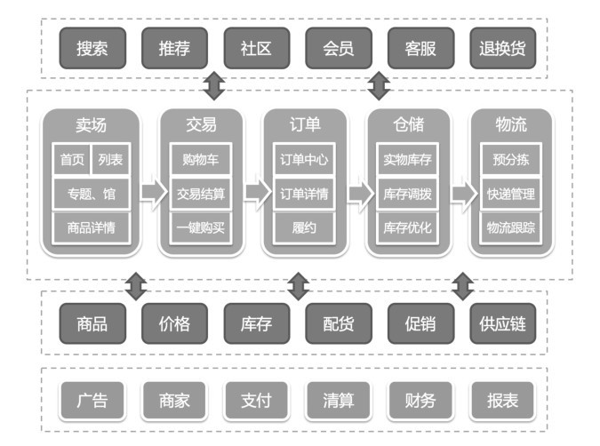 以电商行业为例,电商系统在应用系统层面大致可划分为卖场、交易、订单、仓储、物流等主流程系统,搜索、推荐、社区、会员、客服、退换货等面向用户的前端系统,商品、价格、库存、配货、促销、供应链等面向后台员工的后端系统,以及广告、商家、支付、清算、财务、报表等面向合作伙伴的辅助系统,每个应用系统又会划分为很多子系统。一个粗略的电商系统业务架构如图1-1所示。