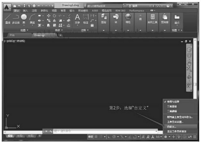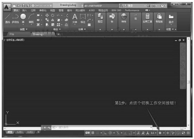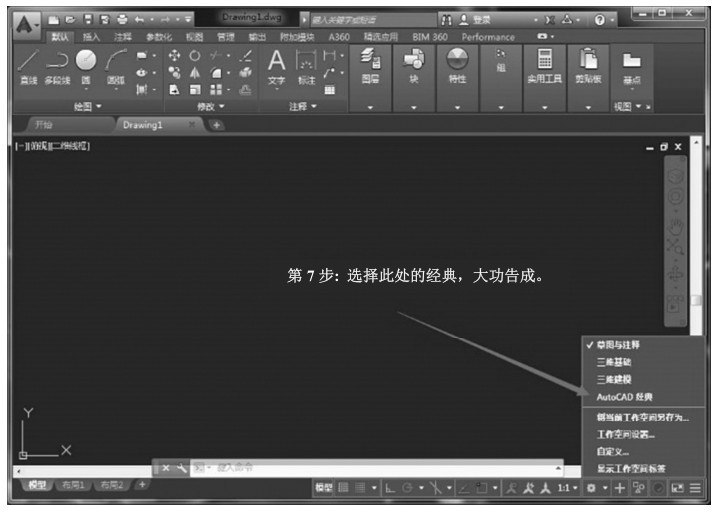 在工作空间中选择“AutoCAD经典”,如图1-32所示。然后,软件的界面就变成经典样式,如图1-33所示。
