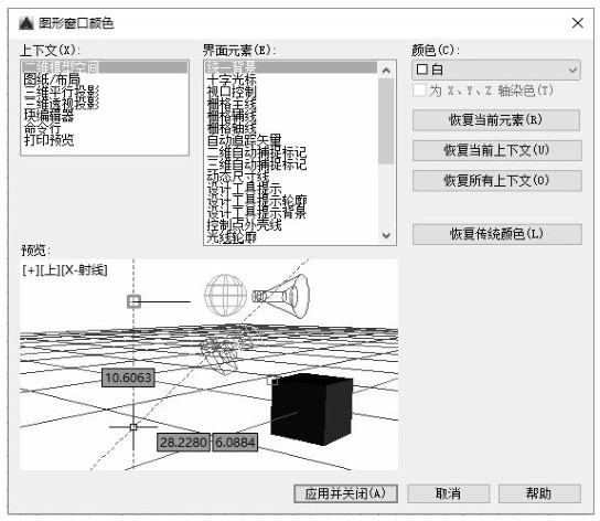 通过“图形窗口颜色”对话框里的选项,选择要修改的组成部分,然后在“颜色”下拉列表中选取需要的颜色,然后单击“应用并关闭”即可完成颜色修改操作。
