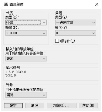 选项组中,可以分别选取“类型”和“精度”下拉列表中的选项值来设置图形单位的角度类型和精度。默认的角度类型为“十进制度数”、精度为“0”。需要注意的是,通常情况下,角度以逆时针方向为正方向,如果选中