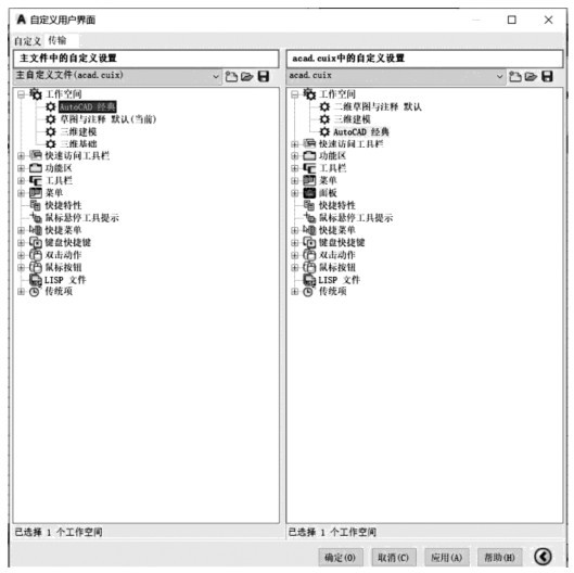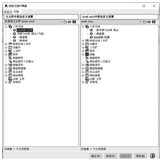 选中左边“AutoCAD经典”,单击“应用”及“确定”按钮,如图1-31所示。