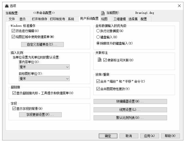 ,在弹出的下拉菜单中单击“选项”按钮,此时界面上弹出“选项”对话框,如图1-21所示。