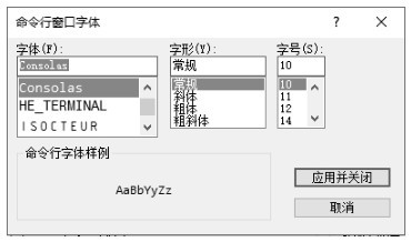 命令行的字体及其大小可根据用户的意愿进行更改,其操作步骤与设置窗口颜色的设置步骤类似。