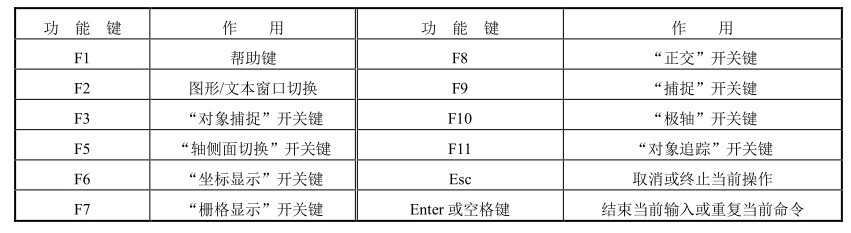 功能键是 AutoCAD 系统常用操作的快捷键,利用它们可以进行各种绘图辅助功能的快速切换和开关。常用的AutoCAD功能键如表1-2所示。