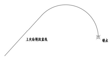 该种方法创建的圆弧是相切于上一次绘制的圆弧或直线。选择图2-25中的“连续”命令后,选择需要绘制连续圆弧的的位置点,然后系统会立即绘制出以该点为起点的圆弧,并与该点所在直线或圆弧相切,如图2-31所示。