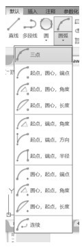 圆弧是圆的一部分,绘制圆弧一般需要指定三个点。通过将圆心、起点、端点、半径、角度、长度等进行组合,可以有多种绘制圆弧的方法,具体在功能区的“默认”→“绘图”→“圆弧”按钮下,如图2-25所示。