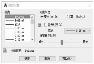 ●“列出单位”选项组:用于设置线条宽度的单位,可选中“毫米”或“英寸”单选项。