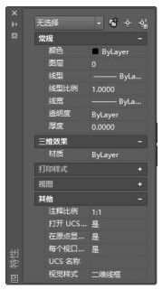 “特性”选项板列出选定对象或对象集的当前特性设置,可以通过选择或者输入新值来修改特性。当没有选择对象时,在顶部的文本框中将显示“无选择”。此时“特性”选项板只显示当前图层的基本特性、图层附着的打印样式表的名称、查看特性以及关于UCS的信息。若选择了多个对象,“特性”选项板只显示被选对象都有的公共特征。