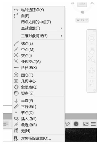 在该菜单上选择需要的捕捉命令,在把光标移到要捕捉对象特征点附近,即可选取现有对象上所需的特征点。在快捷菜单上除了“两点之间的中点(T)”“点过滤器(T)”与“三维对象捕捉(3)”子命令外,其余各项都与工具栏中各种捕捉按钮一一对应。