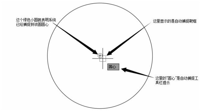 (对象捕捉)按钮(或者按 F3键、Ctrl+F 键)使其关闭。设置自动对象捕捉模式后,当系统要求用户指定一个点时,把光标放在某对象上,系统便会自动捕捉到该对象上符合条件的特征点,并显示出相应的标记。如果光标在特征点处多停留一会儿,还会显示该特征点的提示。这样用户在选点之前,只需要先预览特征点的提示,然后再确认就可以了。