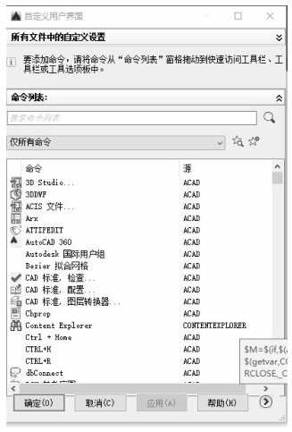 用户也可以为快速访问工具栏添加命令按钮。在快速访问工具栏上右击鼠标,在系统弹出如图1-7所示的快捷菜单中选择“自定义快速访问工具栏”选项,系统将弹出“自定义用户界面”对话框,如图1-8所示。在该对话框的“命令”列表框中找到要添加的命令后将其拖到“快速访问工具栏”,即可为该工具栏添加对应的命令按钮。