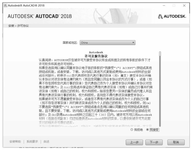 系统弹出AutoCAD 2018安装界面2(见图1-2),在“国家或地区:”下拉列表中选择“China”选项,然后选中“我接受”单选项,单击对话框中的“下一步”按钮。