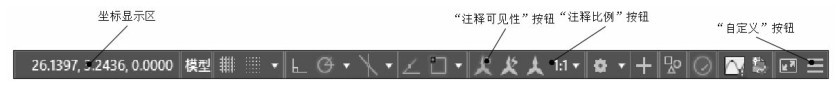 状态栏位于屏幕底部,它用于显示当前鼠标光标的坐标位置,以及控制与切换各种AutoCAD模式的状态按钮,如图1-16所示。