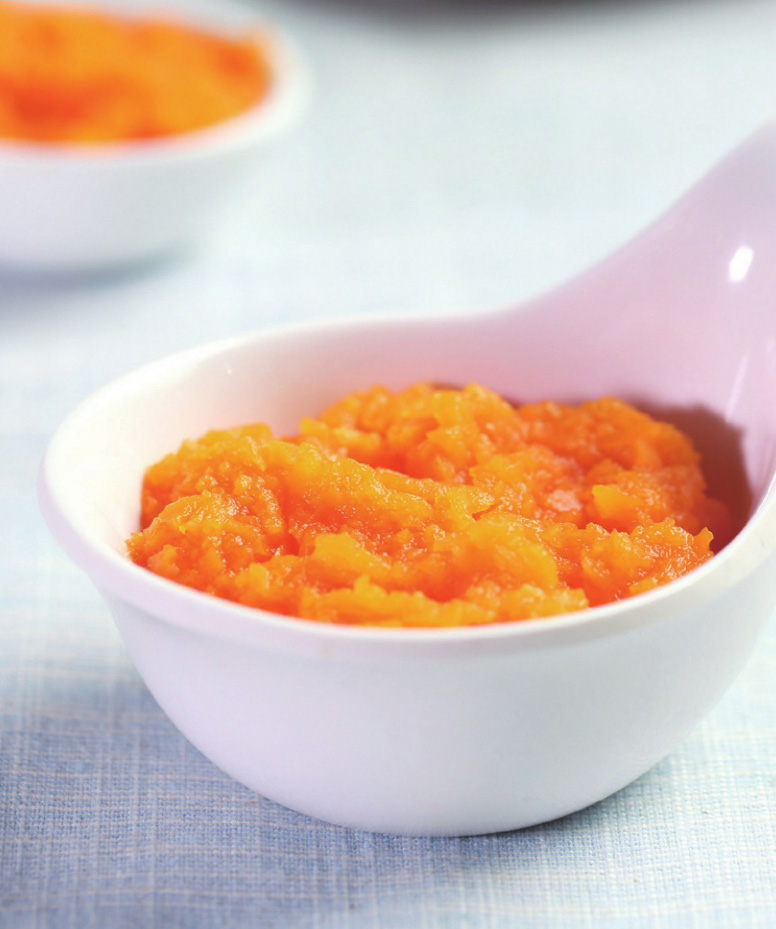 2.将胡萝卜片放入蒸锅蒸软,压成泥,直接用小勺喂给宝宝吃。
