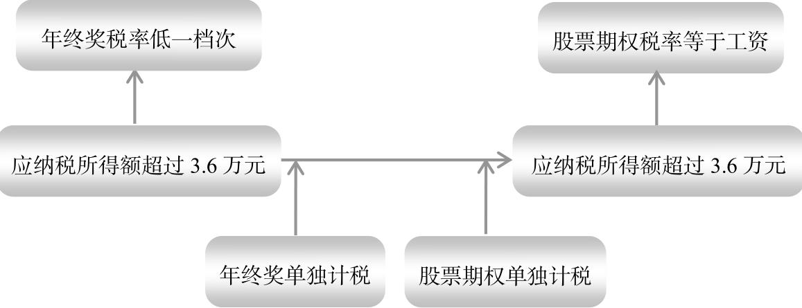 在条件允许的前提下,纳税人如能充分且合理利用多种税收优惠政策,如综合利用年终奖与股票期权所得单独计税的政策,可以最大限度地降低整体税收负担。筹划的具体方法为,股权期权与综合所得适用相同的税率,年终奖适用的税率比综合所得适用的税率低一个档次。