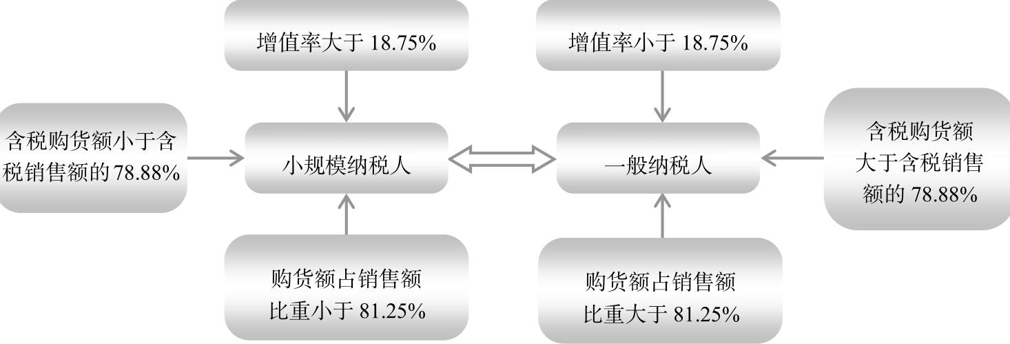 需要指出的是,这里所考虑的仅仅是企业的增值税税收负担,而不包括其他因素。因此,在决定是选择一般纳税人还是小规模纳税人身份时,不能仅仅以增值率为标准,还要考虑企业对外经济活动的难易程度以及一般纳税人的会计成本等。由于后者难以量化,因此,纳税筹划更多地体现了一种创造性的智力活动,而不是一个简单的计算问题或者数字操作问题。