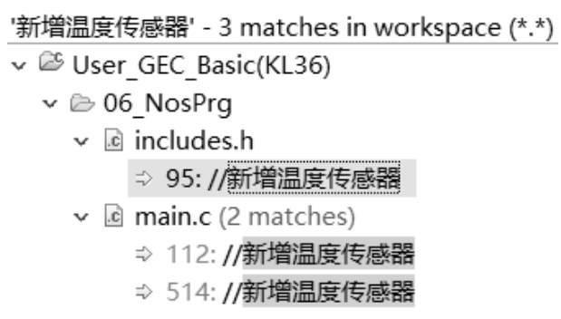 为了最终确认终端用户程序所有更新的区域,这里采用 5.2 节开头介绍的搜索步骤,通过搜索关键词“新增温度传感器”可得到如图 5-5 所示的用户程序更改后的全局搜索效果图,共搜索到3处添加内容。至此,终端用户程序更改完毕。建议注释“新增温度传感器”时使用唯一标识,最好由“功能、作者、时间”要素构成,以便在搜索定位时可在工程中找到这一功能的全部修改处。