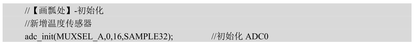(2)在main.c文件中对ADC进行初始化。考虑到如果需获取温度,就要将温度的模拟量转为数字量,这时需要初始化ADC。考虑到不确定ADC是否进行过初始化操作,因此需要添加用户的初始化函数。这里的ADC初始化函数adc_init对应的参数分别是A通道、单端模式、16位采样精度、硬件滤波次数为32次,具体详情请参考工程中的adc.h文件。在main.c文件中搜索“【画瓢处】-初始化”,确认“画瓢处”的位置,然后添加用户的初始化ADC的代码,如下所示。
