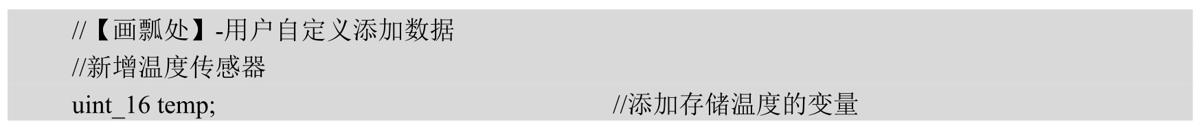 (1)在 includes.h 文件中增加存储温度的变量。为了获取热敏传感器采集的温度 A/D转换采样值,考虑到该MCU为16位A/D转换采样,我们添加一个16位无符号整型变量temp来存储温度,在includes.h文件的结构体gUserData中增加一个成员变量。同时也可以在 includes.h 文件中搜索“【画瓢处】-用户自定义添加数据”,确认“画瓢处”的位置;通过在“//【画瓢处】-用户自定义添加数据”的下面一行添加新的注释“//新增温度传感器”,为后续的统一验证做铺垫。由于该操作与后续步骤一致,这里不再重复介绍。