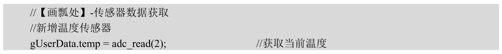 (3)在main.c文件中将A/D转换采样值赋给发送结构体的成员变量。在定义成员变量、初始化ADC之后,需要进行A/D转换采样。由5.1节可知,新增的热敏传感器连接在GEC的PTE18引脚上,该引脚具有A/D转换采样功能,使用的是ADC0模块的2号通道,具体引脚功能说明详见附录B.4。在main.c文件中搜索“【画瓢处】-传感器数据获取”,并在此处增加获取当前温度的代码,即可得到当前温度,具体代码实现如下所示。注意,这里的成员变量名temp必须与步骤(1)相同。
