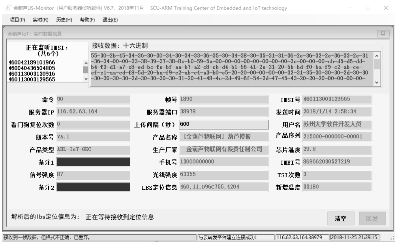 做好全部的前期工作之后就可以进行联合测试了。在确保本地计算机已联网,且已安装 VS2013 的前提下,双击运行 5.3 节工程目录的“bin\Debug”文件夹下的 AHL-IoT.exe程序。触摸终端(UE)的TSI触摸键位置3下,可触发终端上传操作,将数据传至US-Monitor,上传后的效果如图5-10所示。通过更改温度传感器所获取的温度值,可以看到采集的数据呈现规律性的变化,说明上传数据是正确的。通过多次触摸TSI,可触发多次数据的发送,在US-Monitor中可以观察到每次发送的数据。