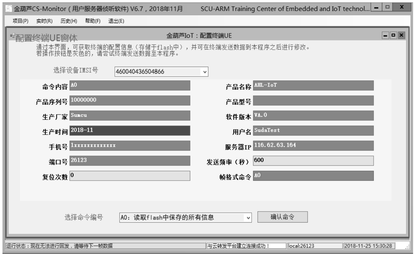 CS-Monitor程序能够接收到数据,则UE程序发送的地址及端口号需要与CS-Monitor程序运行地址及侦听端口号保持一致,即与6.3.3节中设置的HCIComTarget保持一致。借助用户更新程序AHL-UserPrgUpdate的“更改Flash信息”功能,可对服务器IP与服务器端口号进行修改。