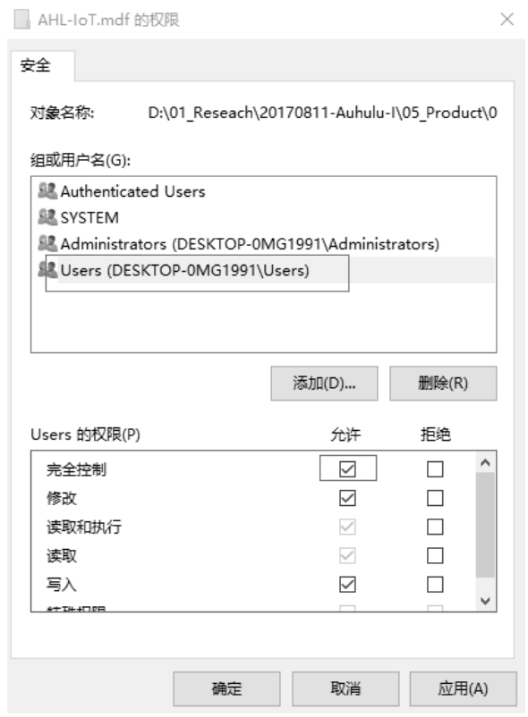 (1)在DataBase文件夹下,右击AHL-IoT.mdf文件,在弹出的菜单中选择“属性”,在弹出的对话框中选择“安全”选项卡。
