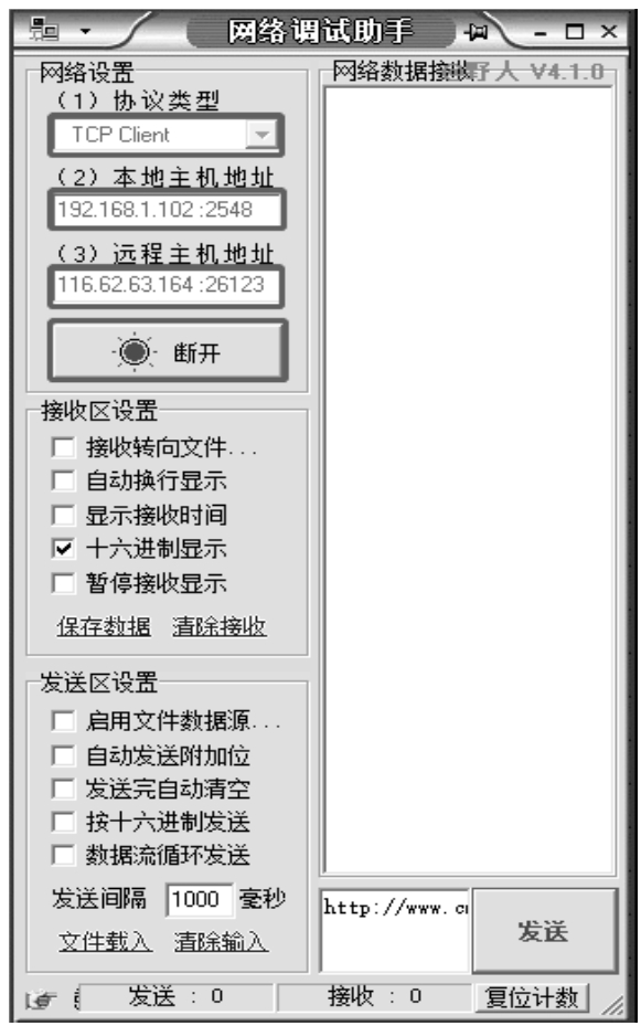 在联网的用户计算机上,同样双击运行位于网上光盘“..\05-Tool”文件夹下网络调试助手NetAssist.exe。