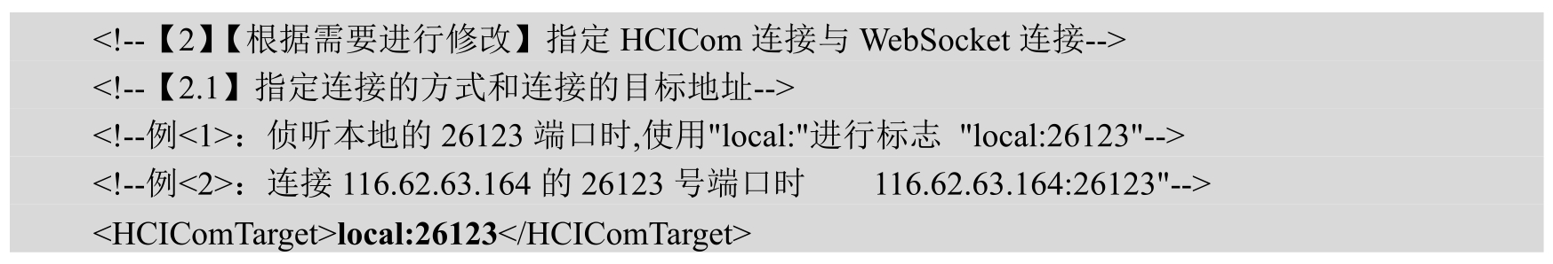 HCIComTarget键值表示CS-Monitor的HCICom连接方式与连接的目标地址。例如,侦听本地的26123端口时,使用local:26123进行表示;连接116.62.63.164的26123号端口时,表示为 116.62.63.164:26123。CS-Monitor 需要选择侦听本地端口,且该侦听端口不能被其他程序与其他线程占用。可参照6.3.1节,使用网络调试助手来确定某一端口是否被使用,如本地计算机处调试助手可以连接到云服务器的某一端口,说明该端口已经被占用。本例选择侦听本地端口26123,故修改结果如以下代码所示。