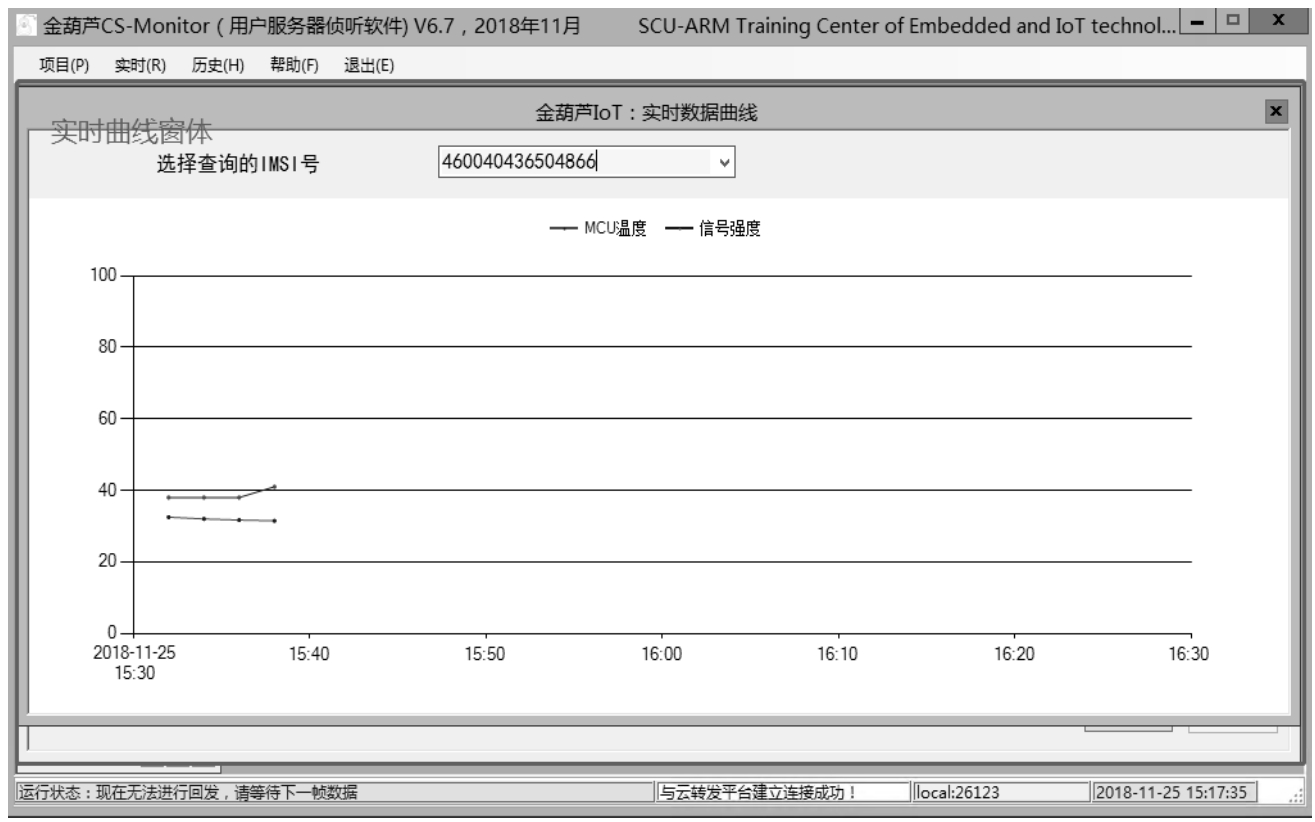 (3)实时曲线窗体。如图6-8所示,单击菜单栏中“实时(R)”→“实时曲线(D)”可打开实时曲线窗体。实时曲线窗体可以显示最近一个小时内指定IMSI设备某些数值的变化曲线。